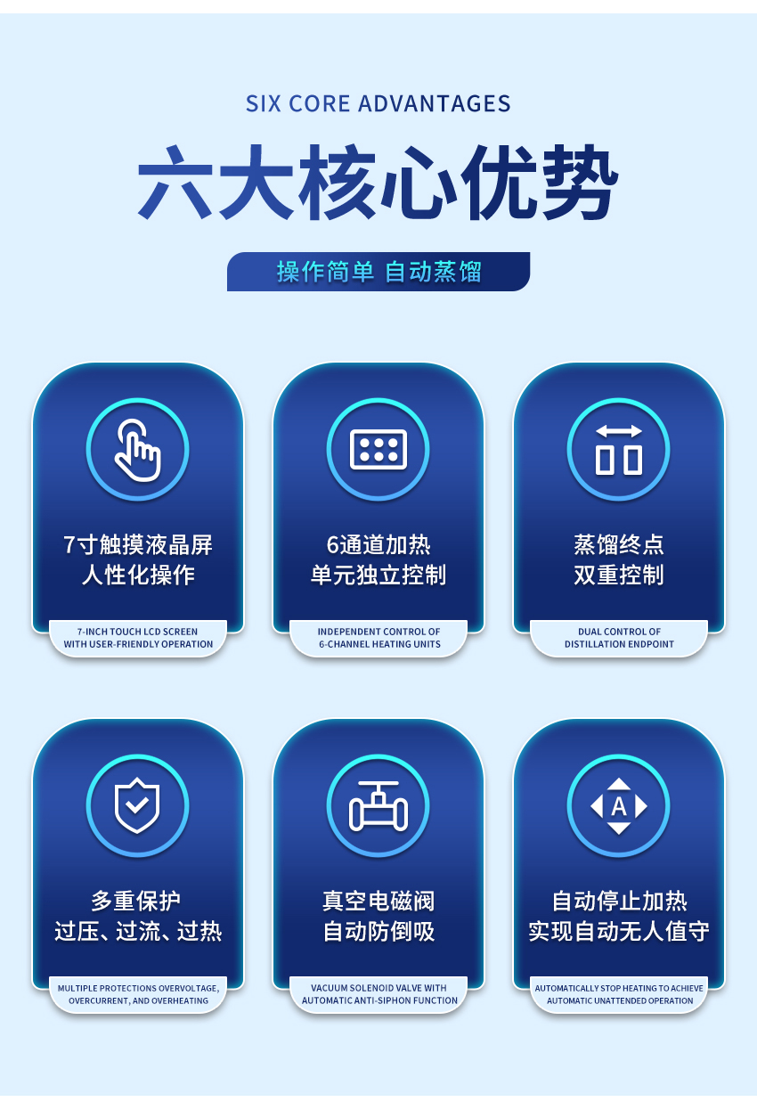 本产品在传统仪器基础上融入独特设计理念,具备加热均匀、体积控制蒸馏终点、防倒吸、冷却水循环降温及回流装置等技术。智能一体化蒸馏仪实现了操作简单、美观实用、节能降耗等目的,可广泛用于环保、食品检测、疾控、供排水、高校、科研院所、厂矿企业等各化验室需要蒸馏处理的场所。