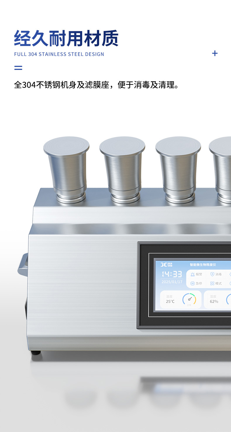 1.经久耐用的材质:全304不锈钢机身及滤膜座,拉丝工艺,美观大方,便于消毒及清理。
