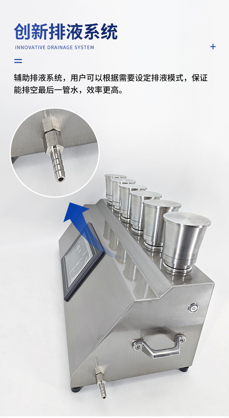 7.创新排液系统:为解决最后一软管废水排不净问题,全新研发了辅助排液系统,用户可以根据需要设定排液模式,保证能排空最后一管水,不会滴水残留,洁净桌面内置进口隔膜液泵,效率更高。