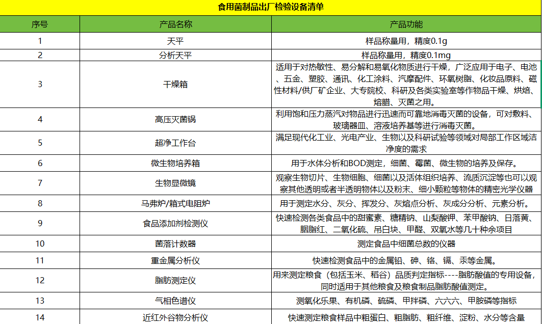 食用菌制品出厂检验设备清单
